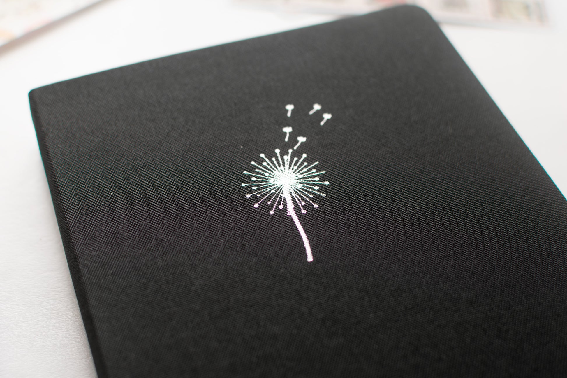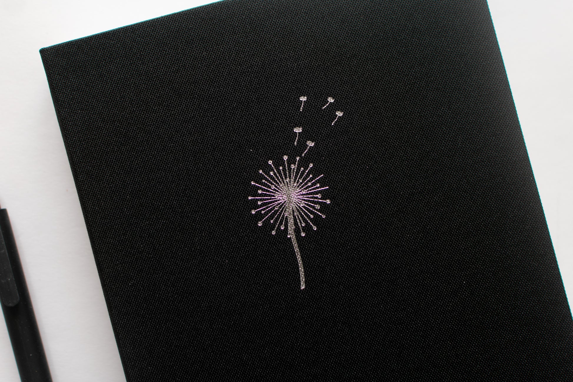 Decorated with an enchanting silver dandelion design on a black fabric cover.