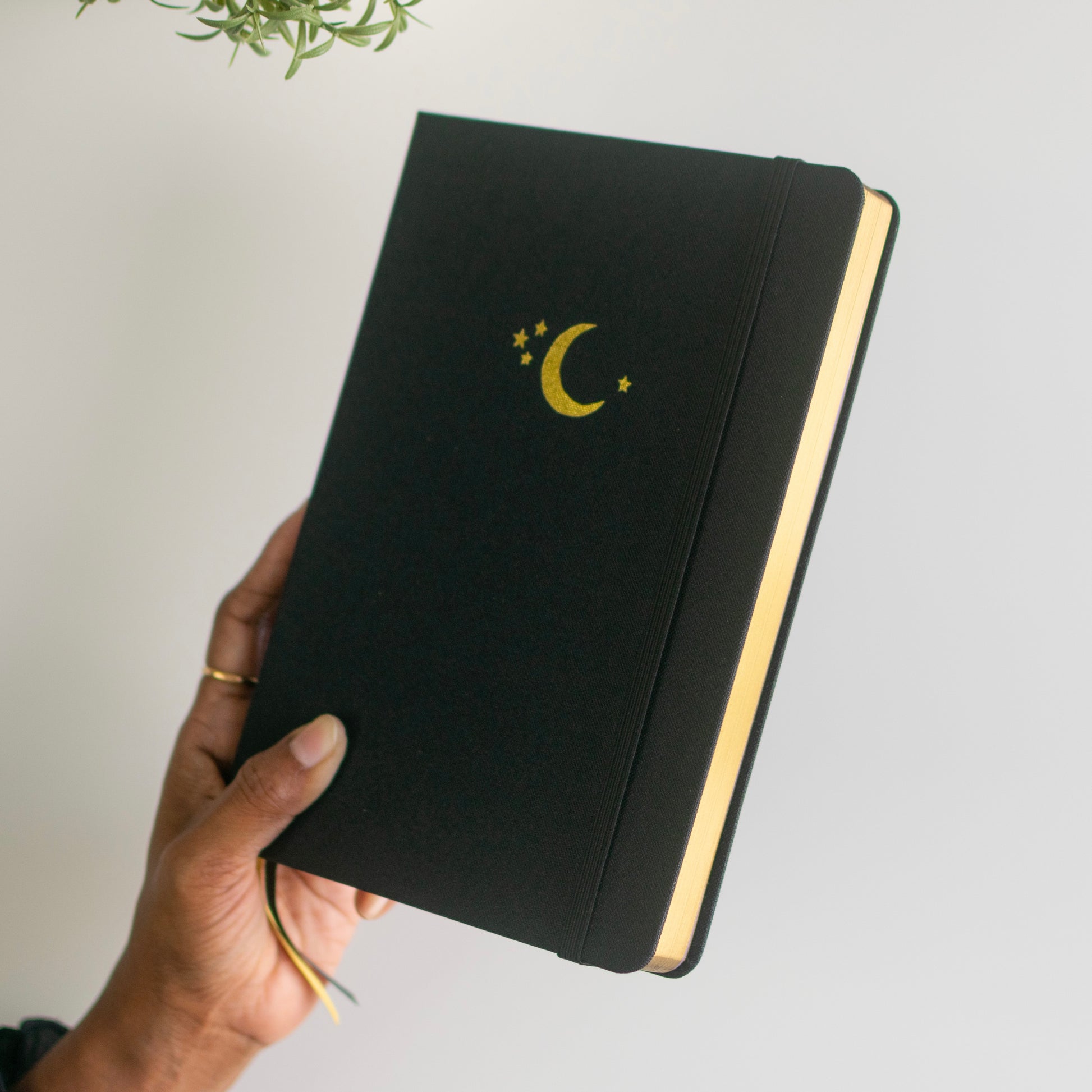 MoonStar Bullet Journal brings together smooth black fabric with a beautiful moon and in etched metallic gold page edges.