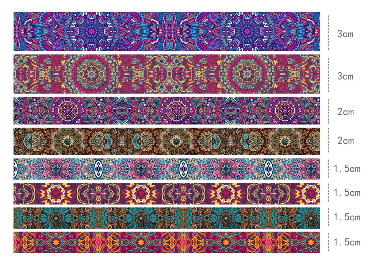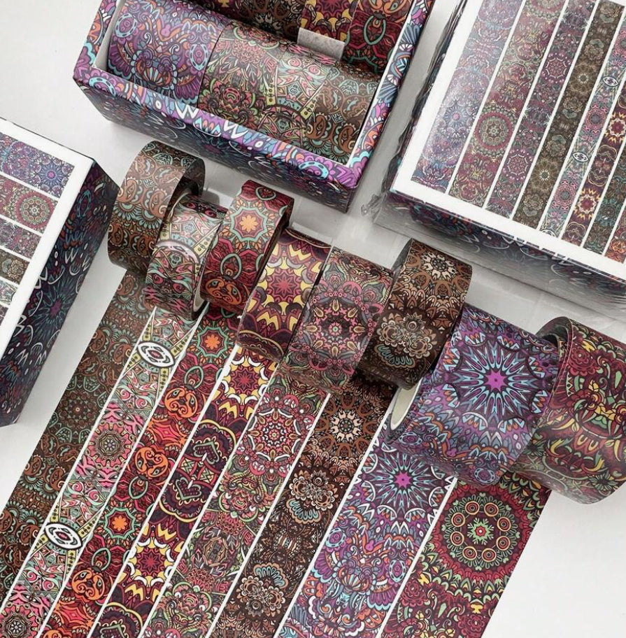 Mystic Mandala Washi Tape set features 8 unique designs, each showcasing a beautiful mandala in boho style. Use them for scrapbooking, journaling, and adding a touch of whimsy to any project.