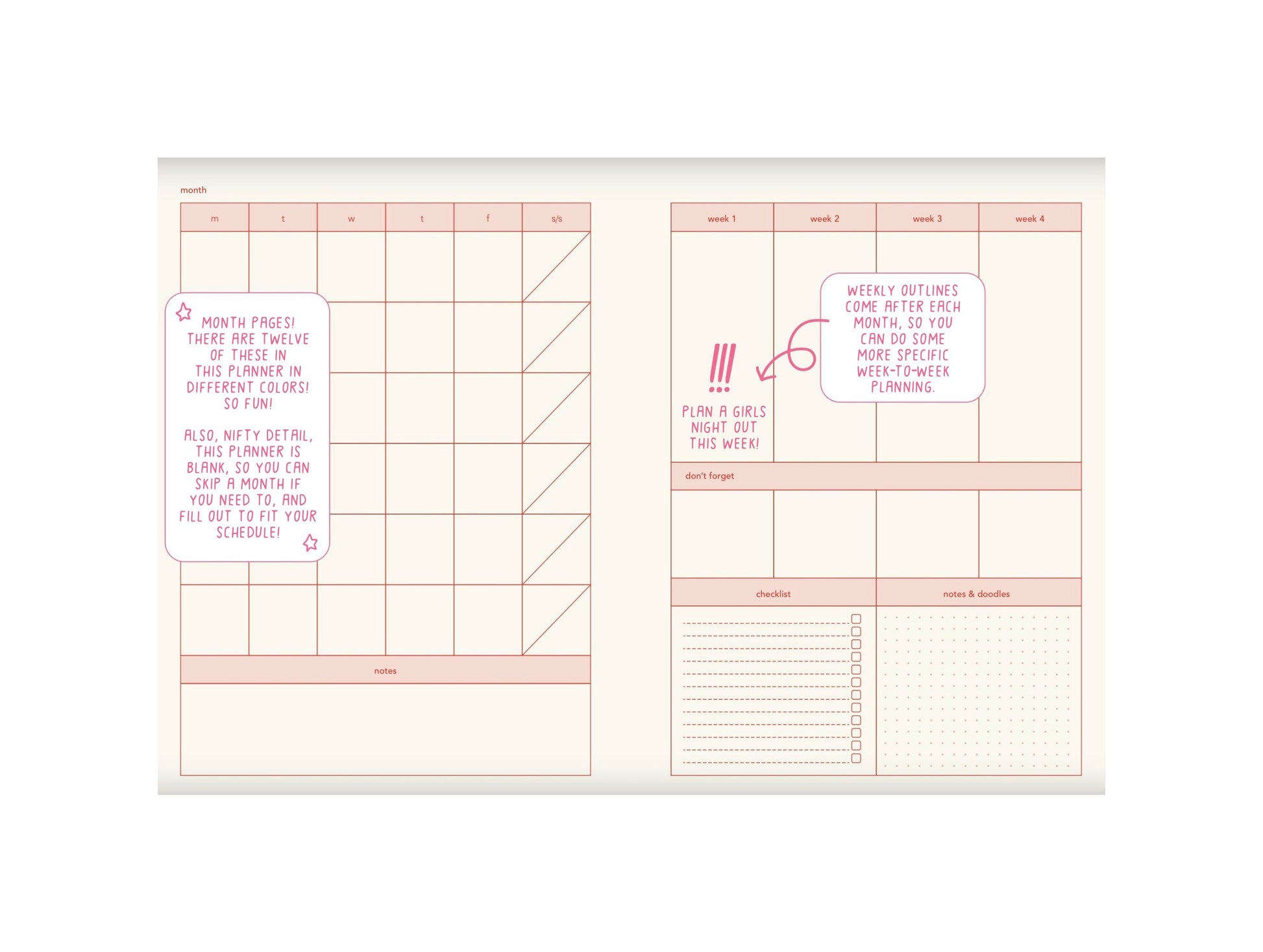 12 Monthly color-coded sections, blank calendars, week-at-a-glance charts, daily tasks, inspirational art pages, colorful notebook lines & more!